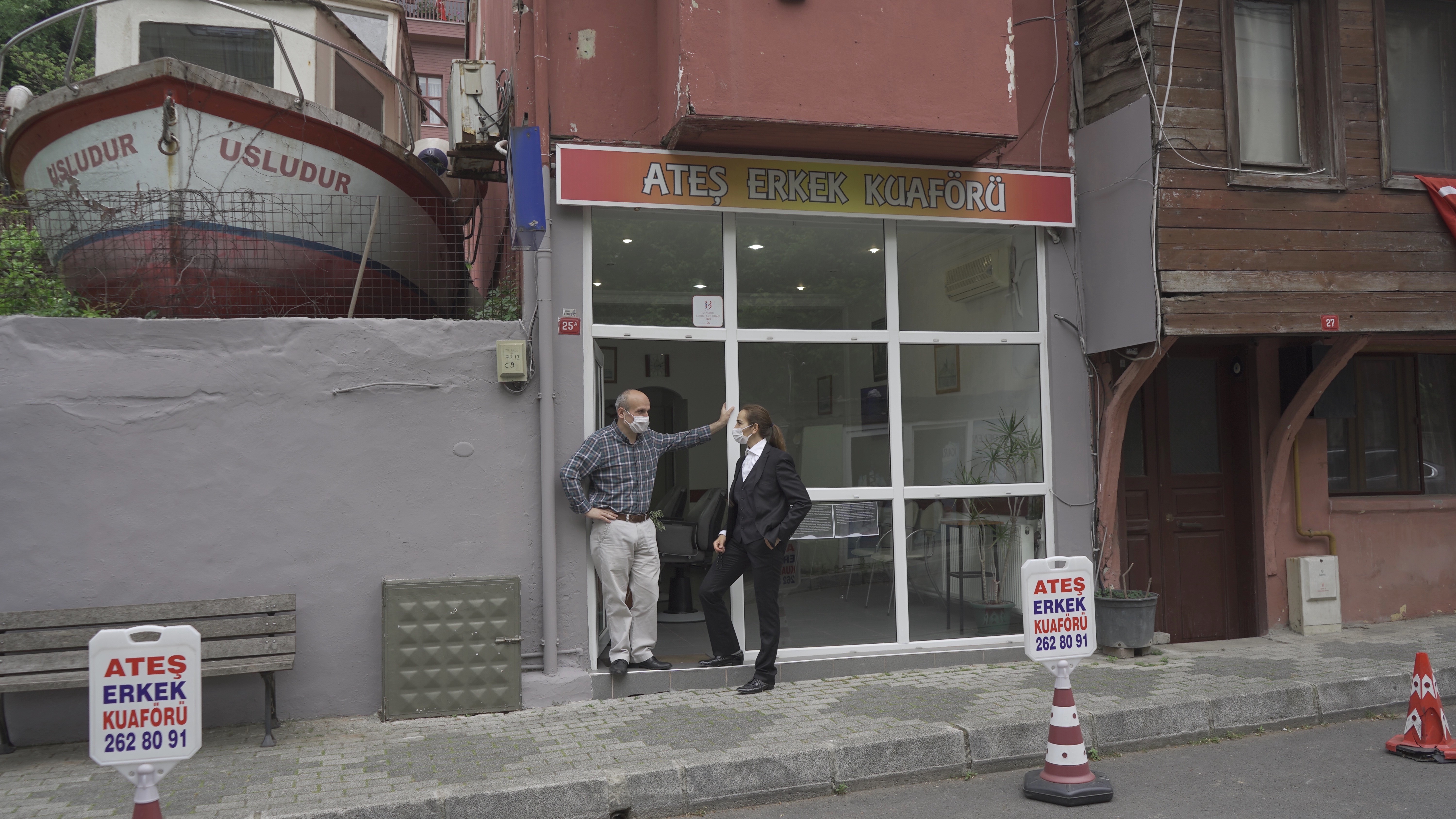 Mehtap Baydus Performance-Charakter „Osman“ vor einem Herren-Frisör in Tarabya (Istanbul) | Foto (Ausschnitt): Ünsal İçöz
